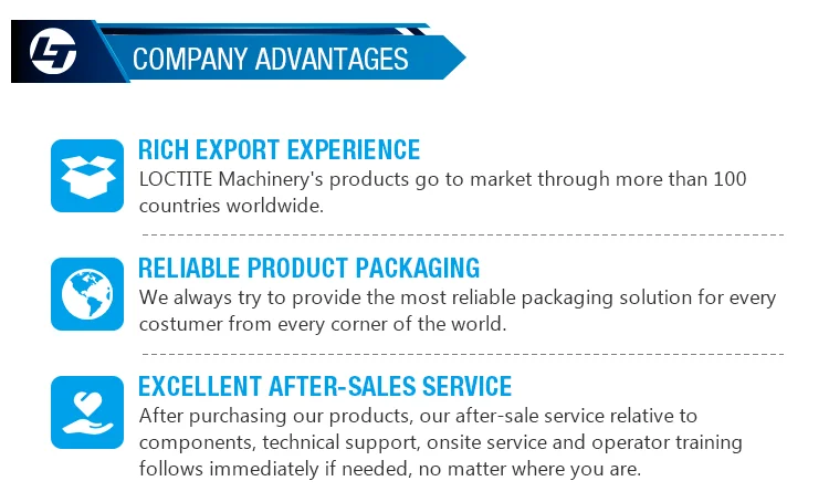 LOCTITE Machinery's products go to market through more than 100 countries worldwide. We always try to provide the most reliable packaging solution for every costumer from every corner of the world. After purchasing our products, our after-sale service relative to components, technical support, onsite service and operator training follows immediately if needed, no matter where you are.