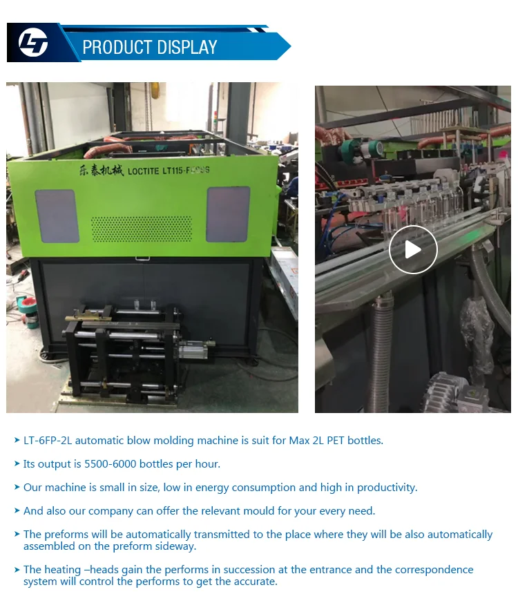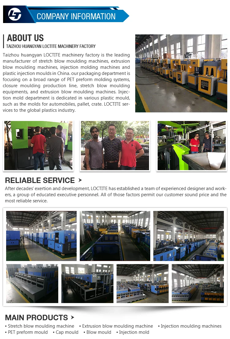 Taizhou huangyan Loctite machinery and mold factory supply PET bottle blow molding machine, extrusion blow molding machine,pet preform mold,caps mold,preform and caps,we can supply u full line from raw material to bottle.we have more then 10 year in this